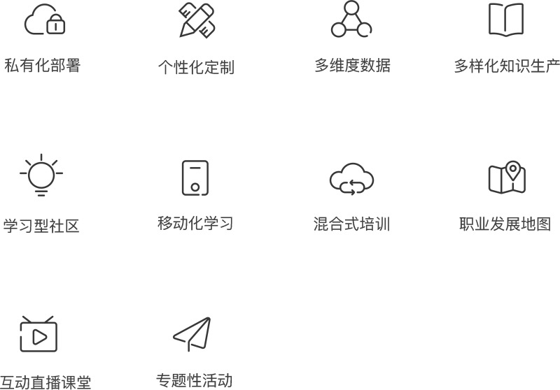 为企业提供一体化培训和企业学习解决方案,建立先进的人才培养体系,提供丰富的企业学习体验,用丰富的生产、管理工具,为管理者提供精准的评价、反馈数据。通过构建积极、活跃的学习型组织,促成个体的终身学习,实现企业的快速发展。
