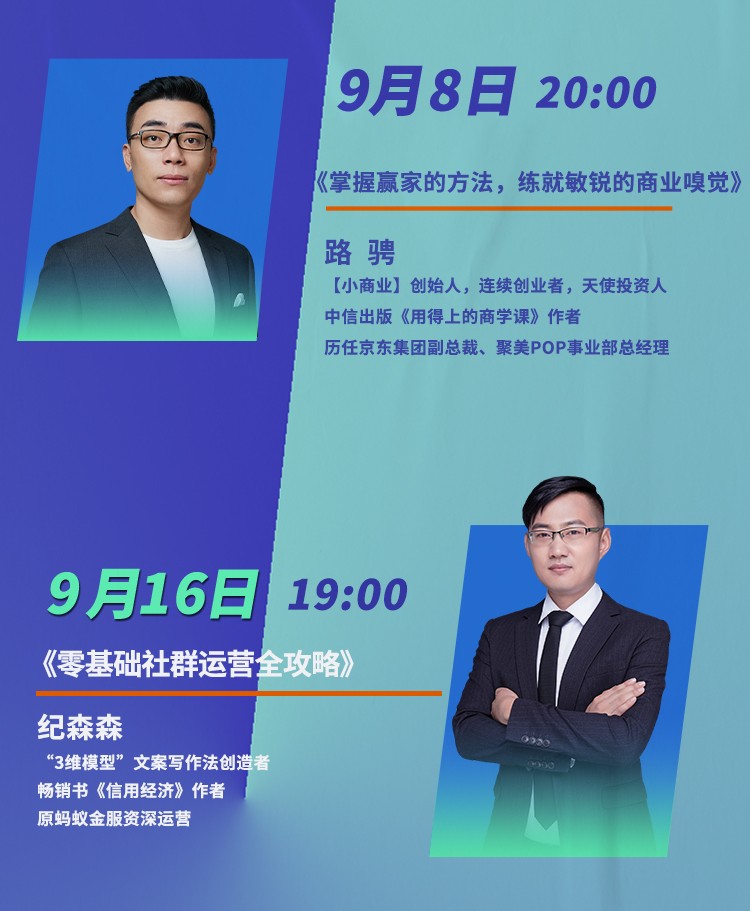 9月8日 20:00,【小商业】创始人,历任京东集团副总裁、聚美POP事业部总经理路骋老师,将在量子教育直播间分享《掌握赢家的方法,练就敏锐的商业嗅觉》,带你把握商业机遇。