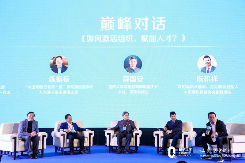 在结束主题演讲后,吴建国还主持了论坛的巅峰对话环节——《如何激活组织,赋能人才?》,与佩蒂股份董事长、九九量子星主席团主席陈振标,第16届风云浙商、杰克控股集团有限公司创始人阮积祥,国防大学战略教研部原副主任、孙子兵法研究中心主任、教授、博导薛国安将军,量子教育校董、浙江大学资深法律专家沈志坤一同探讨了企业人才培养新范式。