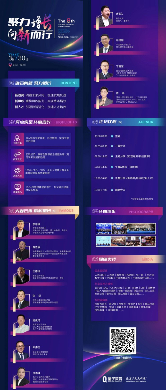 「聚力增长·向新而行」第八届知识·价值高峰论坛于3月30日在浙江·杭州,现场特邀宏观经济专家、科技专家、组织发展专家等10+余位大咖莅临现场,分享行业前沿趋势与独到见地,将有1000+ CEO、CHO、企业大学校长等行业同仁齐聚杭城,共赴这场一年一度的千人行业知识盛会,为企业管理者在时代变局中开创新局提供增长密码!