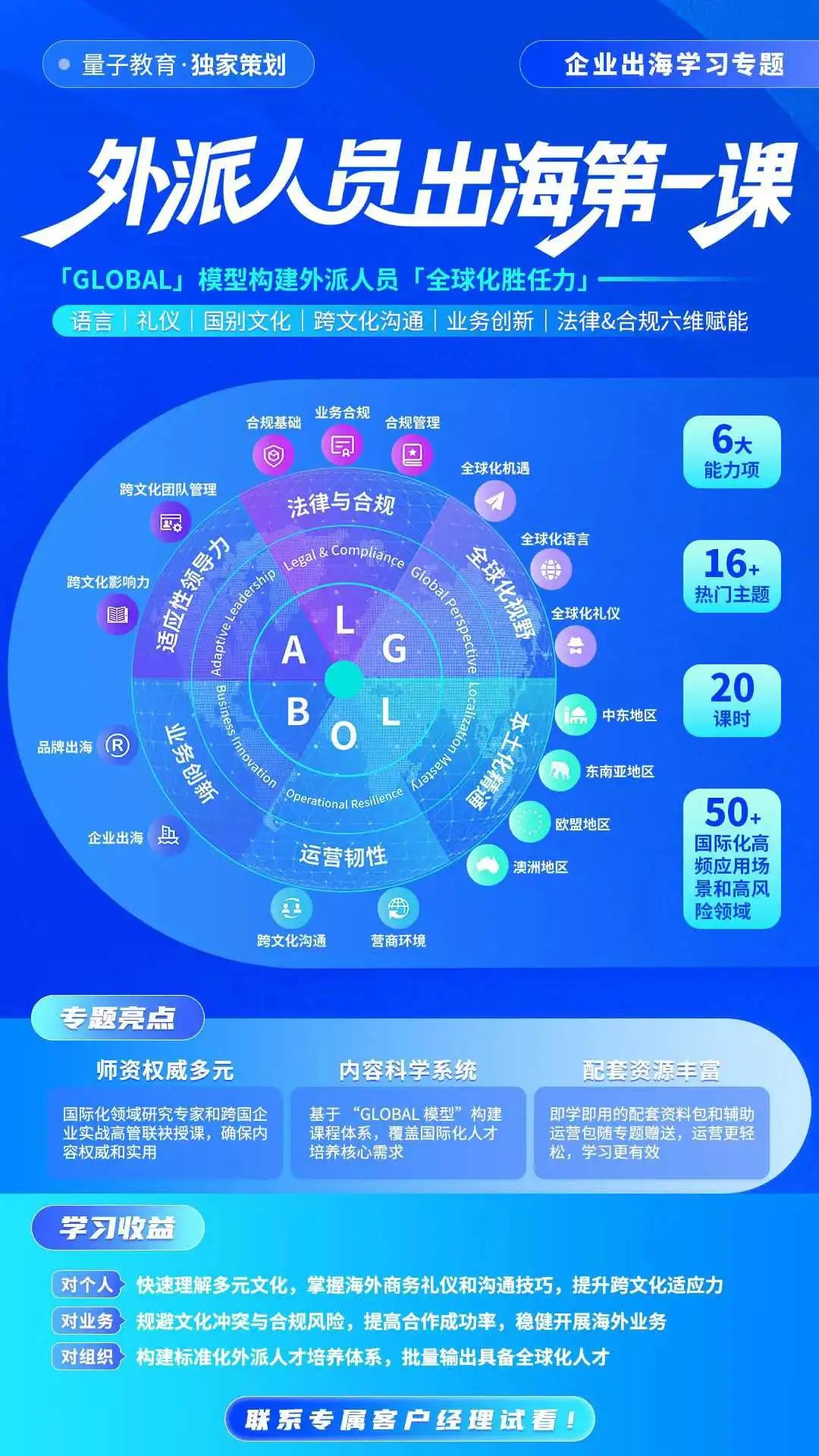 《2024出海人才管理报告》显示:76.4%出海企业面临法律法规挑战,42%外派人员因文化冲突首年离职,海外国家经理平均任期仅1.8年。基于此,量子教育集结国务院发展研究中心、社科院及华为/京东/惠普高管,推出“企业出海学习专题”,基于GLOBAL模型构建系统性培养方案。